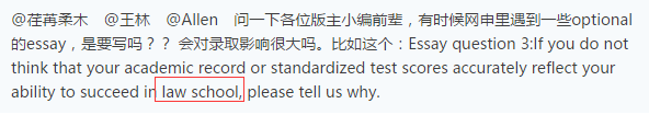 @荏苒柔木 @王林 @Allen 问一下各位版主小编前辈,有时候网申里遇到一些optional 的essay,是要写吗?? 会对录取影响很大吗。比如这个:Essay question 3:If you do not think that your academic record or standardized test scores accurately reflect your ability to succeed in law school, please tell us why.